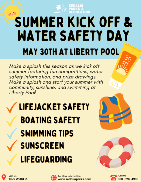 All lifeguards are required to attend a Red Cross Lifeguard Certification course. The cost is $200 for a 2 year certification. For returning guards that need to get recertified, the cost is $100. Please bring appropriate swim suit/trunks, change of clothes, water bottle, packed lunch, and pen and paper for notes. Must be at least 15 years of age by the final day of class. If hired by Sedalia Parks and Recreation, training is covered for free.