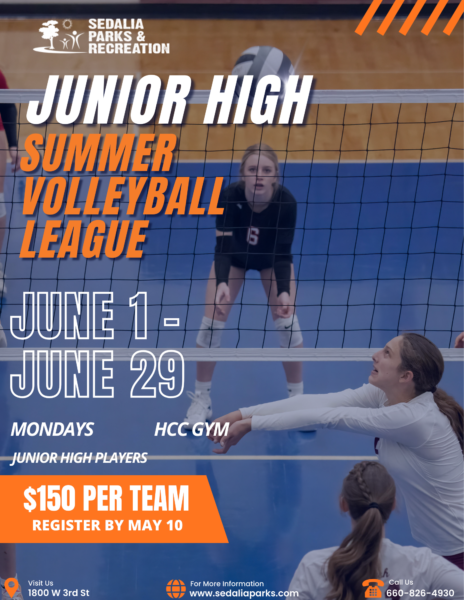 The Sedalia Parks & Rec. Youth Volleyball program is open to boys and girls designed to develop an understanding of rules, fundamentals, teamwork and sportsmanship. Practice will be held at the Heckart Community Center during the week beginning late August. Eight to 12 games will be played starting in mid-September, and the season will end roughly November 5. This league plays other towns so there will be traveling to Cole Camp, Green Ridge, Centerview, Windsor, and Warrensburg. In addition to 8 games two tournaments will be held on Fridays and/or Saturdays. Games and practices are mostly on Mondays & Wednesdays.