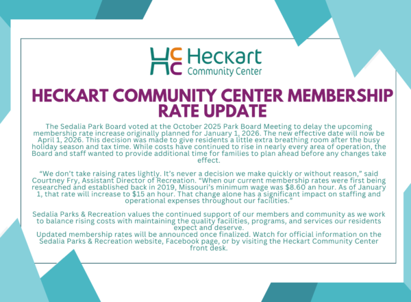On August 6, 2019, Sedalia voters had the opportunity to vote on 2 ballot issues that would allow the Heckart Community Center to be built. We are happy to announce that both ballot issues passed and work has begun to move this project forward. The facility will be multi-purpose and include an indoor aquatic facility, community center rooms, convention space, basketball/volleyball/pickleball courts, a fitness area, party rooms, child watch area, an indoor playground, and will be the home of the Sedalia Senior Center.